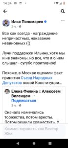 «Все как всегда — награждение непричастных, наказание невиновных ((( Лучи поддержки Ильину, хотя мы и не знакомы, но все, что я о нем слышал — сугубо позитивное! Похоже, в Москве оценили факт принятия Съезд Народных Депутатов новой Конституции…» — написал Илья Пономарев на своей странице в Фейсбуке